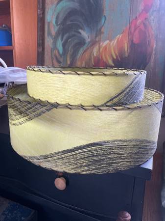 Beautiful, mid century two-tiered, yellow/green, black, white fiber, glass swirl lampshade- all the laces are intact. $55
