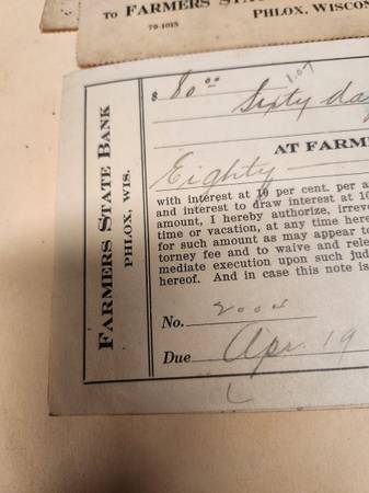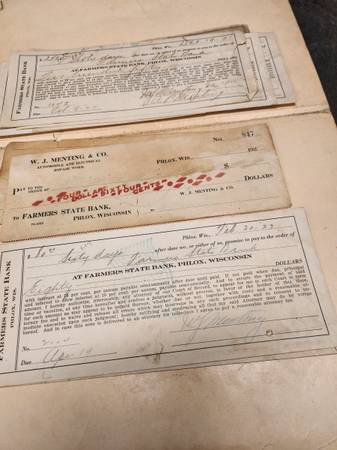 Dates from the 1920s. From the Farmers State Bank Phlox Wisconsin for W J Menting. $5 each. Pick up in phlox