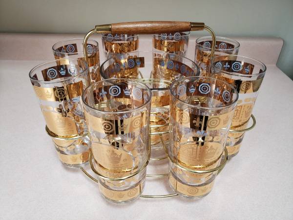 1970's MCM Highball Set with Ice Bucket. This set of 8 glasses has been kept in a smoke and pet free home for 50+ years in a china cabinet. All items were carefully washed and put back year after year - it's very possible it was never used. Excellent condition.