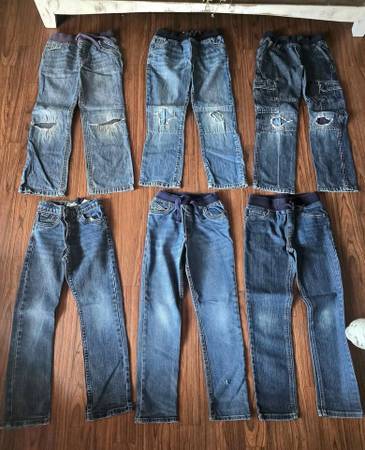 Price is firm. Will not separate. Located in Rhinelander. Six-piece bundle of boys stretchy waist jeans size 7. The three pair on top were made to look like the knees are worn on the top layer. One pair does have discoloration there though. Another has a small frayed spot near the hem.