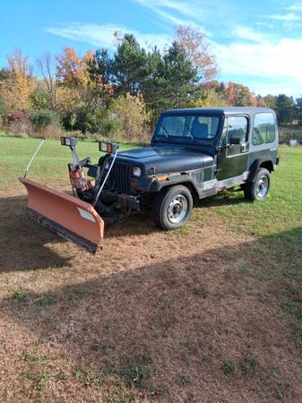 1991 jeep with a 6 foot 6 inch western plow. Body is rusty. Has a 4 cylinder motor and a 5 speed transmission. Was parked 12 years ago because the slave cylinder went out on clutch. The plow was put on new 15 years ago for 3500 dollars. It has special heavy duty brackets mounted to the bumper. The plow could be mounted to another vehicle very easy. It would have to be put on a trailer to move. Asking 2000 dollars. What do you have to trade. Open to a lot of things.