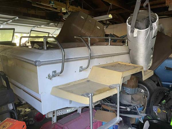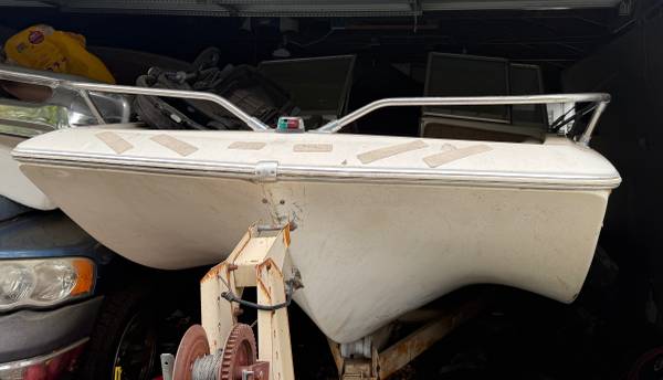 I know nothing really about this boat. I know it has sat unmoved since the day it was bought. It’s been in a garage since but before that it was exposed to the weather from another. I know it needs a plug and the floor inside needs some old. I do know that at some point that motor did fire up. It doesn’t have a title because the dumnas that bought it forgot that detail.