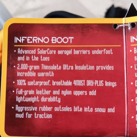 New with tags mens sz 8 1/2, womens sz 10. 2000 gram insulated Almost some pair just sold for $128 on Ebay