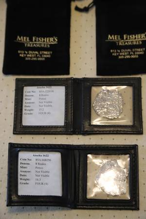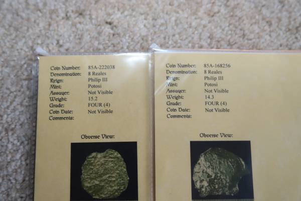 Nuestra Señora de Atocha (Spanish: Our Lady of Atocha) was a Spanish treasure galleon and the most widely known vessel of a fleet of ships that sank in a hurricane off the Florida Keys in 1622. The Atocha was located by the legendary treasure hunter Mel Fisher in 1985. For sale are two Grade 4, 8 Reales, Potosi mint, that sat at the bottom of the Gulf of Mexico for 363 years. I purchased these two pieces of history from The Mel Fisher Museum in Key West Florida in 2014. I had them reappraised by the Mel Fisher Curator in 2022 at $1100.00 each, significantly more than I paid for them. These extremely rare coins appreciate in value each year and are a great investment in addition to owning a piece of history. Included in the sale will be the Certificate of Authenticity for each coin from Mel Fischer’s Treasure L.L.C., Appraisal Certificates for each coin from 2022, a DVD video and several books related to the historic find of the Atocha. Asking $1,000 each.