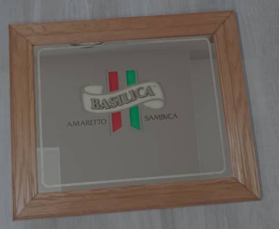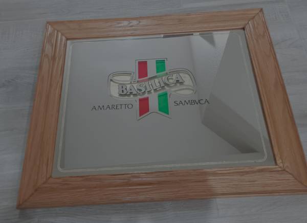 This rare, framed Basilica bar mirror from Italy is a must-have for collectors. The mirror features a beautiful design showcasing the popular Amaretto Sambvca Sambuca brand. Perfect for displaying in a hunting cabin up north with other wildlife signs and advertising art.