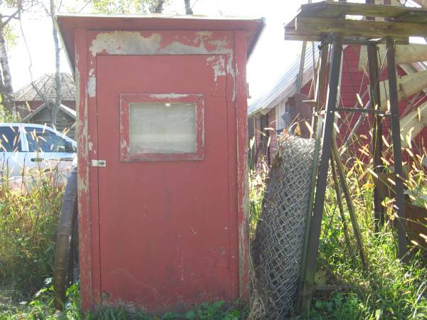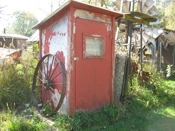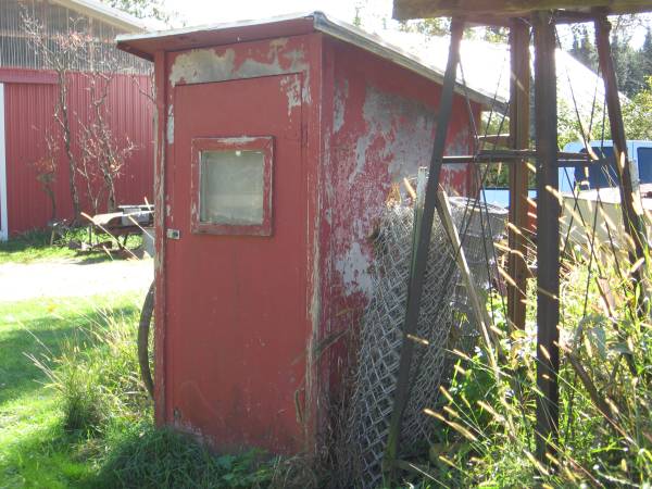 This small shed was once a bus stop shelter. We have just used it for storage. It could be converted to a chicken shed, an outhouse, tack shed, roadside sales stand, used for hunting, just remain a storage shed, or a return to being a bus stop shelter. The exterior paint is really peeling and it could use a couple shingles, but it is a nice size shed that can be easily tipped on its front to haul on a trailer. It has a front and back plastic pieced windows, with one in the door. The door has a latch closure and could have a padlock to keep contents safe. It also has a built in seat that could become a storage bench, possibly. So much to consider and a great size. Nice rustic shed (wheels not included) Email me if interested. Thanks.