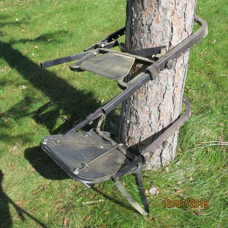 Woods & Water climbing stand and hand climber seat. The platform is 19 inches x 18 inches. Phone calls only 715four57six639. $75.00 OBO.