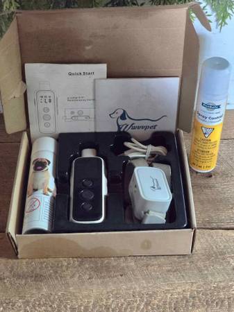 Price is firm. Located in Rhinelander. WWVVPET citronella dog trying collar. It comes with a USB cord to charge (does not have an adapter), two cans of citronella spray, the remote, collar, and manual. The end of the collar has a frayed spot. Works fine.
