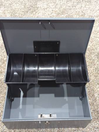 Includes lock but no keys (key not needed because if someone wanted the cash, they'd take the entire box!)
