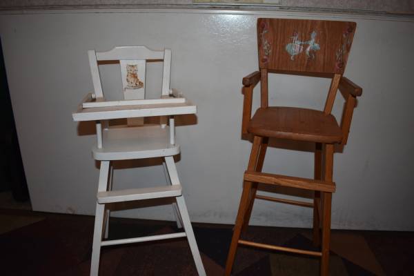 Two doll highchairs, the wood one is at least 60 years old, white one, not sure of age. Asking $15.00 for both. Brown heavy wooden cradle, $5.00 If you see this listing it is still available.....