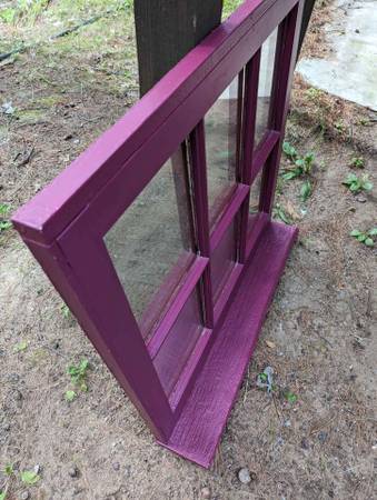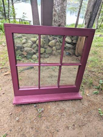Price is firm. Large and heavy primitive wood window looking mirror with shelf that was painted in a sort of maroon-ish shade. There is some minor wear to the paint in some spots. I originally intended to refinish it but just don't have the time. Could be a beautiful piece if updated. There is no hardware to hang it but would be easy to add. It measures 32.75" high, 31.75" wide, and 5.5" deep. Located in Rhinelander.