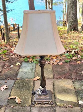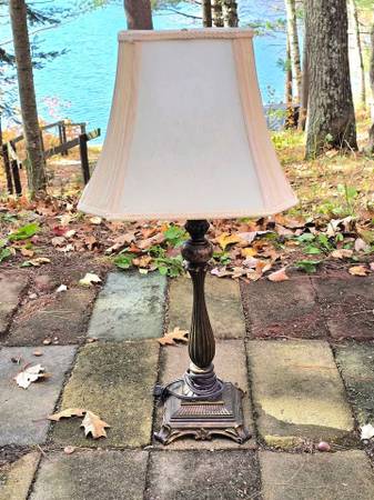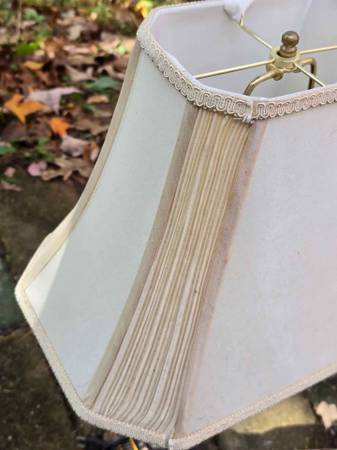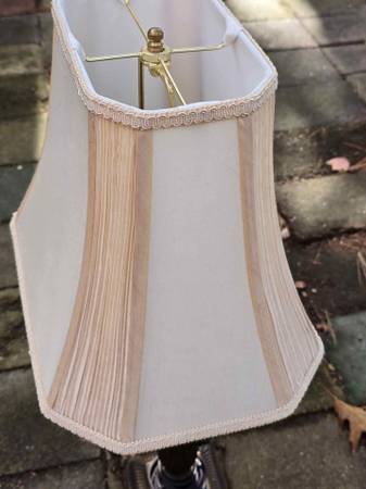 Located in Rhinelander. Lamp with shade. At each corner the pleated pieces are a darker shaded. I'm not sure if it was meant to be that way or if it has discolored over time. It measures 28.25" high...