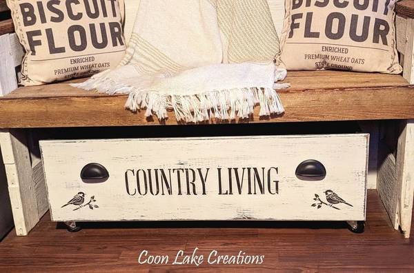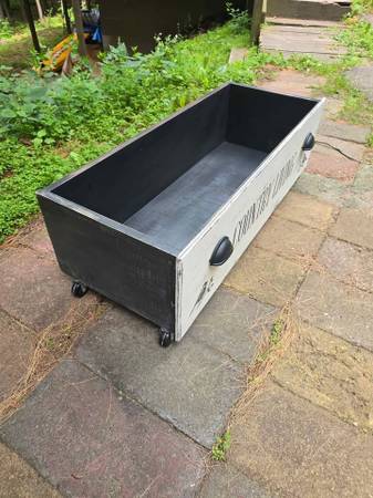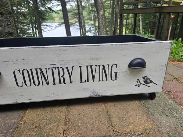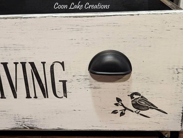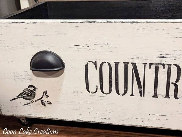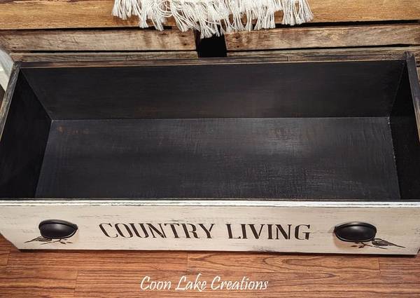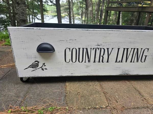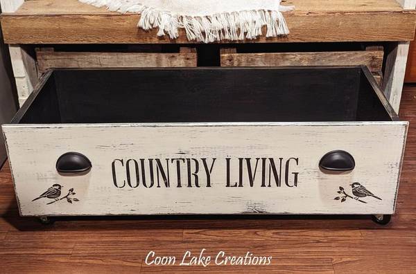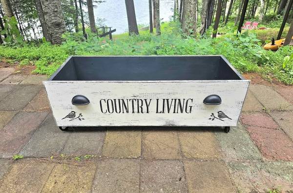 Price is firm. Newly finished pull out wood storage drawer. It was done in "Charcoal Gray" chalk paint with the front in "Linen White" chalk paint over it and all was distressed. The front also had two birds and "Country Living" painted on the front and distressed to age them a bit. Everything was sealed with multiple coats of poly which makes the charcoal color look more black. Two cup handles were also added and done in black and four casters were attached to the bottom. With the casters it measures 12.5" high, 37.5" long and 15" wide not including the handles.