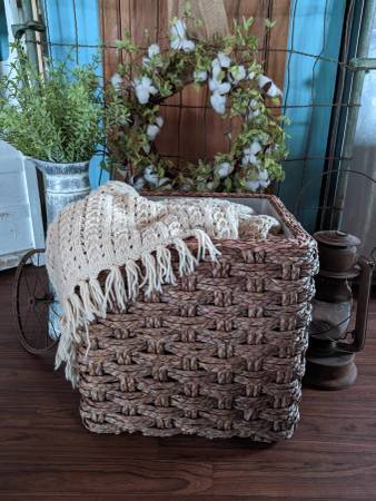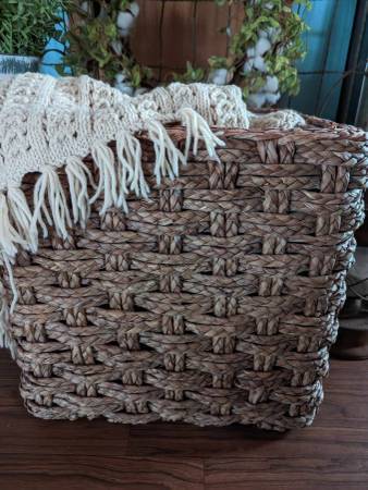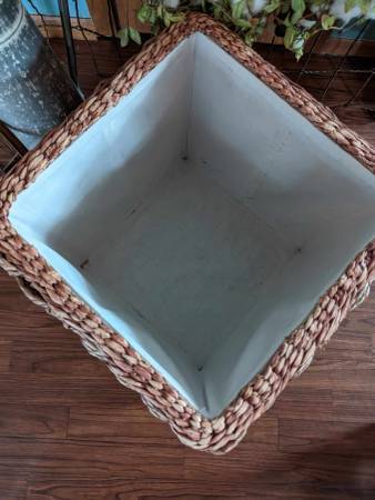Woven brown lined storage cube. It is missing the lid, so it has been used as a decorative blanket basket instead. The inside lining does have some marks and discoloration. It measures 16.5" x 16.5"...