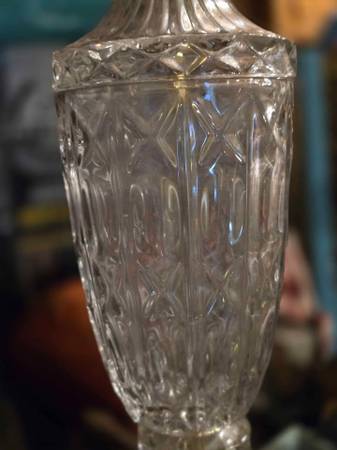 Located in Rhinelander. Vintage glass lamp that measures 27" high with the finial and 6.5" in diameter at the base. There is wear to the finish such as at the base. Please see all pictures. Works...