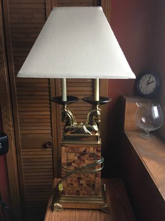 For Sale: Fancy horse themed table lamp. Looks good and works like it should. Base is 10.75 wide by 6.75 deep.Shade is 17 inches wide. Total height is 36 inches.