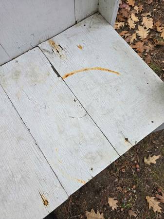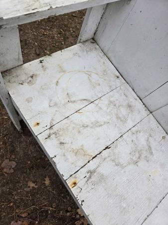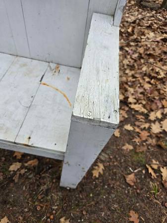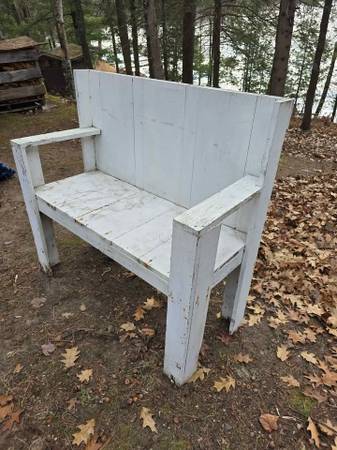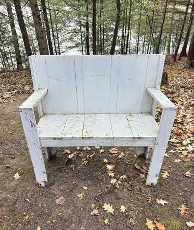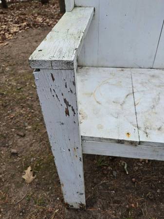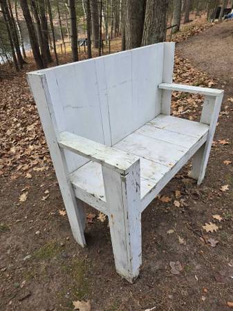 Located in Rhinelander. White chippy paint sturdy wood farmhouse bench. It was used as weathered farmhouse decor so the marks, chippy paint, and other imperfections were left as is, but it could always be fixed up too. It measures 40" high, 41.5" wide, and 18" deep.