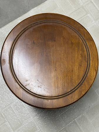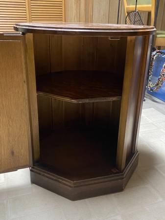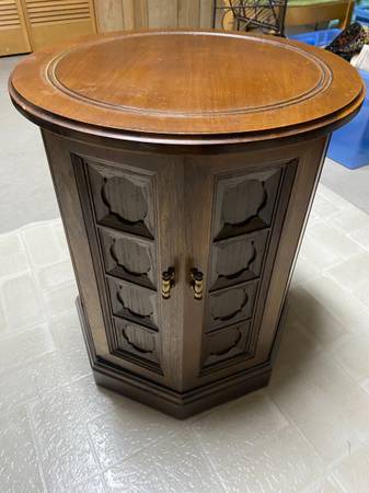 Beautiful handmade stained and varnished octagon shaped wood table and cabinet with shelf. Would work great for an end table or lamp stand. Measures 18 inches in diameter by 21 inches high.