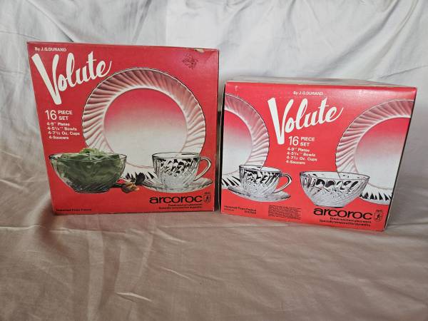 I have for sale 2 boxes of Volute Arcoroc dish sets imported from France-Clearbrook with swirl rim, 16 pc. One box was opened the other is still sealed. $40 each set. Each set includes: 4 - 9"...