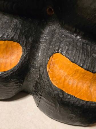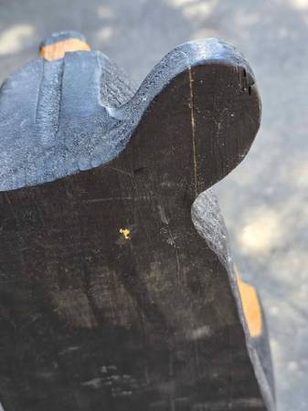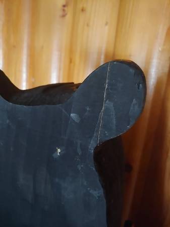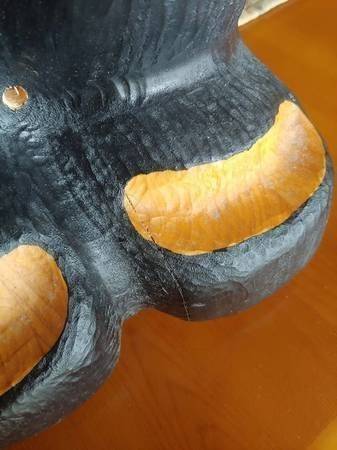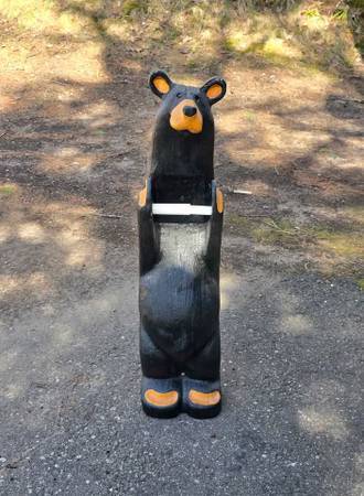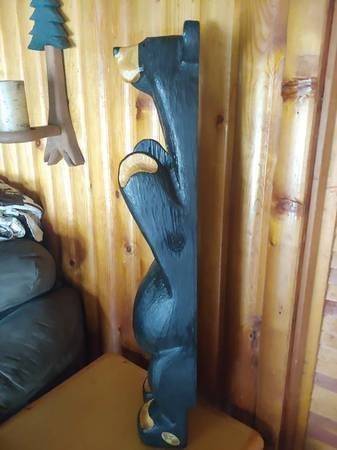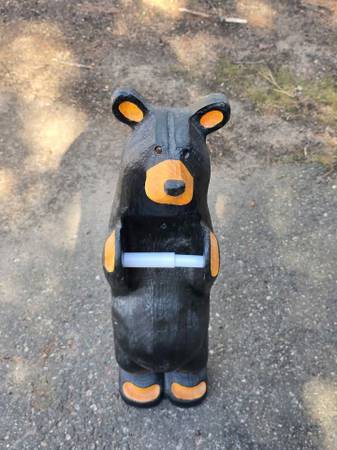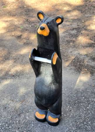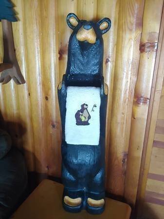 Price is firm. Located in Rhinelander. Big Sky Carvers Jeff Fleming Bearfoots solid pine wood carved "John" black bear toilet paper holder. It can be mounted to the wall (stands up fine against a wall on its own too). One ear split in two and was glued back together. I don't feel it is very noticeable from the front. There are some minor typical scuffs and natural characteristics to the wood such as visible lines and knots. It measures 32" high, 7.75" wide, and 5" deep. Please see all pictures.