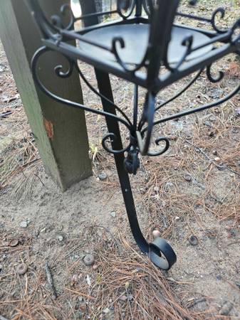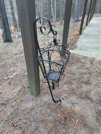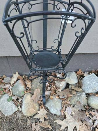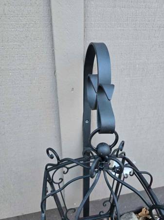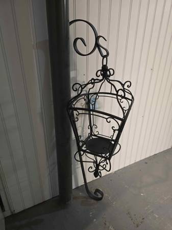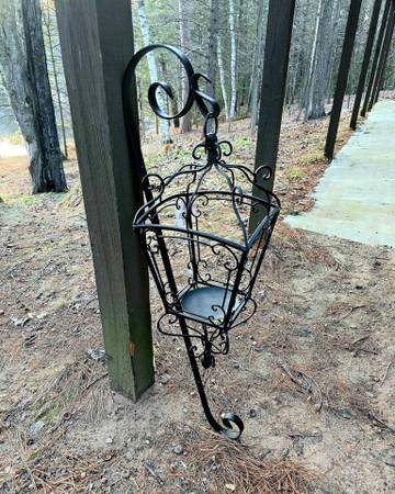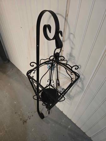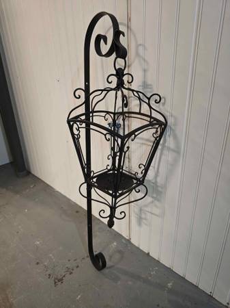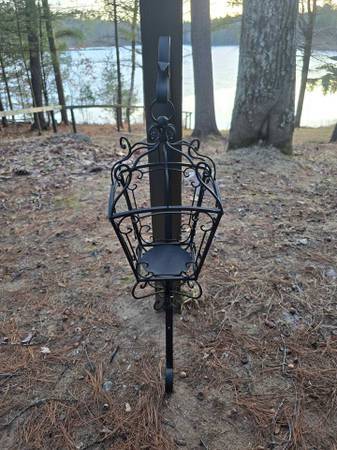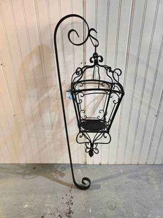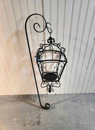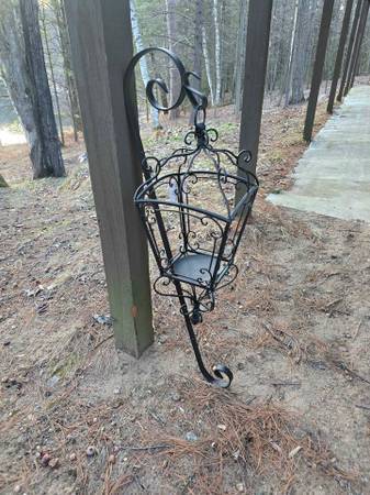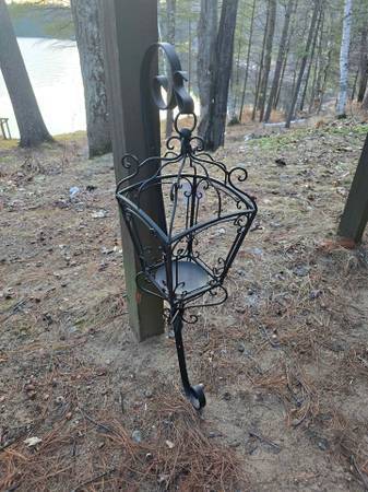 Located in Rhinelander. Price is firm. New with tags black metal large ornate sconce pillar candle holder lantern. It measures 33.75" high and 8.25" wide.