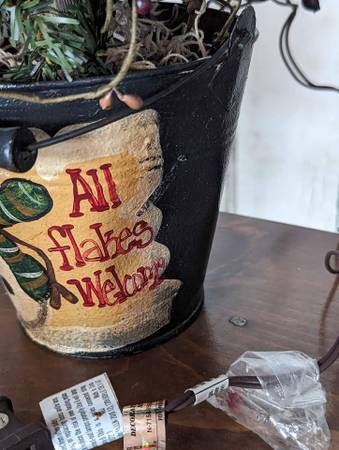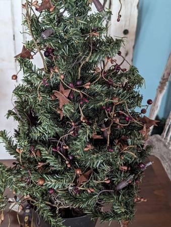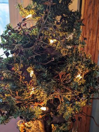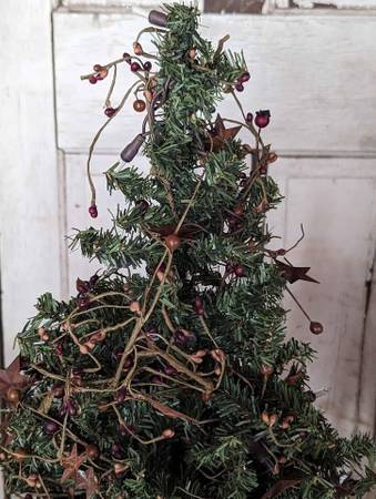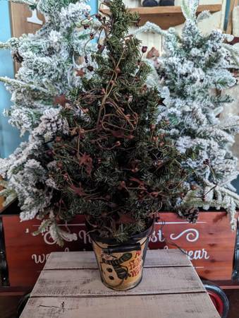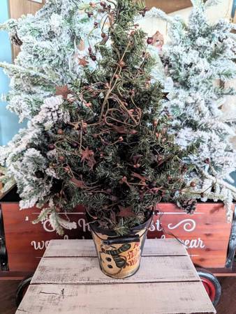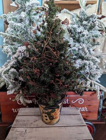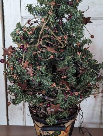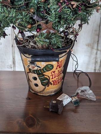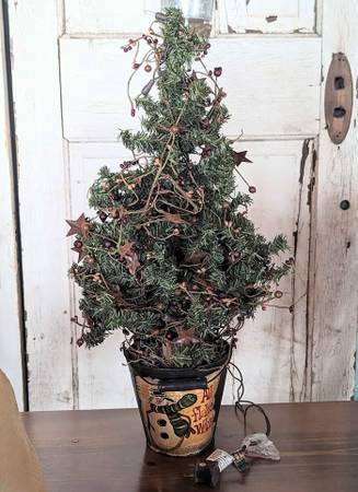 Price is firm. Located in Rhinelander. Primitive pip berry and rusty star light up tree in a snowman pail. The pail does have a dent at one side. It measures 21" high.