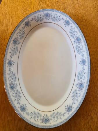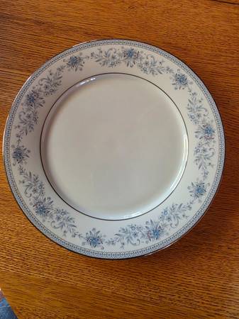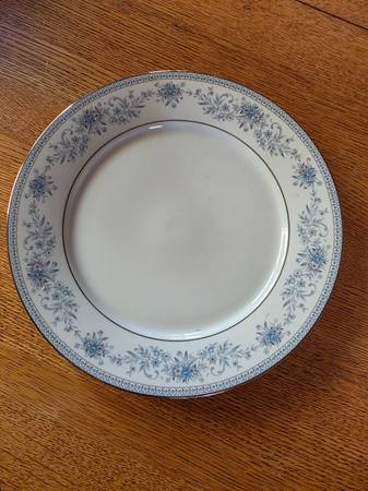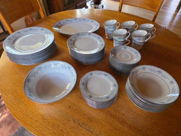 For sale is a set of "Blue Hill" Noritake Contemporary Fine China. This china set is in pristine condition. Serving for 10. Set includes: 10 dinner plates, 10 soup/salad bowls, 10 dessert plates, 10 coffee cups and saucers, 1 serving platter and 1 serving bowl. Price is firm.