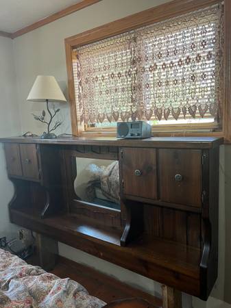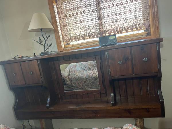 solid wood headboard and behind couch table