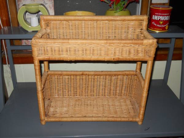 This light colored wicker shelf is 17" tall x 17" wide x 6" deep.