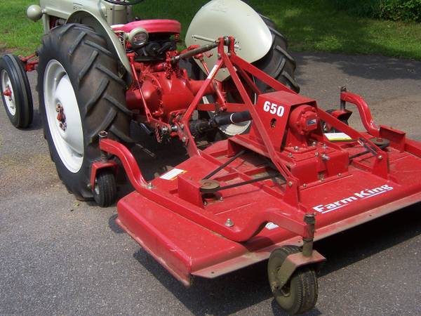 This is a very nice Ford NAA over head valve engine lots of HP to drive the 72 inch Farm King finish mower. Electronic ignition, modern canistor type oil filter, new battery, just spent $1100 on fluids change, Oil pressure is 40 lbs hot or cold. The finish mower was built in Canada a $3000 value, very well made ..no plastic parts. rear discharge. There are tubes in all the mower's tires...The steel covers over the belts are off.. so the grass can be cleaned... The tractor has about a 100 hrs on the rebuild....tractor and mower $7790.... cash or bank check....maybe seen most any time....text show contact info