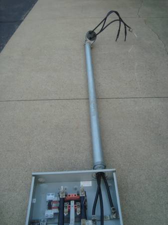 200 Amp duplex meter base for overhead installation. Includes lead-in wire, pipe, masthead, and one 200 amp breaker. Call 715-five 7 three 1 six 9 two