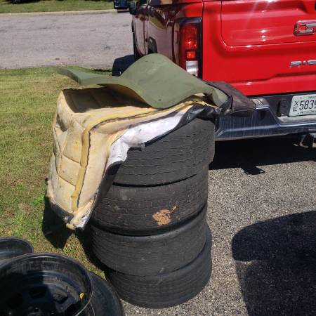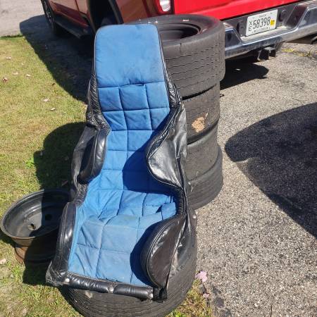 Blue Heavy duty race seat cover, no tears or rips, made for aluminum seat with only one hole for shoulder harness mounting straps, some stains in bottom pad from dirt track racing. Fits 16" seat.