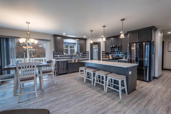 Upon entry of this bi-level build, you are greeted by tall ceilings, a nook for keeping coats and shoes, and easy access to main, lower level and the 2 car insulated garage. The main level features a spacious open concept with lots of windows granting the great views surrounding the home and plenty of natural light. In the kitchen you will find the included stainless appliances, an island+breakfast bar, walk in pantry with built-in shelving and lazy susan, dark finish cabinets with crown moulding, and tile backsplash. The living room offers plenty of space and the main area also features room for dining and a sliding patio door out to the covered back deck.