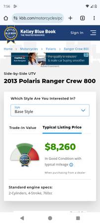 2013 Polaris Ranger 800 Crew limited edition, 2300 miles, power steering, Excellent Condition. Has plow and winch- never used or installed. $8500.00, possible trades for skidsteer.