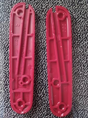 FOR SALE: Brand new Victorinox Swiss Army Knife covers (also known as "scales") for $5. Covers are 84mm in size and the traditional red in color. I purchased these new as replacements for my knife and realized I ordered the wrong type without a corkscrew cutout. The 84mm covers fit the mid-size Swiss Army Knife models including the mid-size Recruit, Golfer, Lumberjack, Sportsman, mid-size Tinker, Tourist and Voyageur. Pictures show the actual scales/covers for sale.