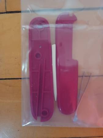 FOR SALE: Brand new Victorinox Swiss Army Knife covers (also known as "scales") with accompanying tweezer and toothpick set for $10. Covers are 91mm in size and the traditional red color with the standard white toothpick and gray-topped tweezers. I purchased these new as replacements for my knife not long ago and realized I ordered the wrong size when they arrived. The 91mm covers fit full-size Swiss Army Knife models including the full-size Spartan, Tinker, Climber, Huntsman and Camper. Pictures show the actual scales, tweezer and toothpick for sale.