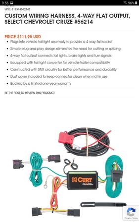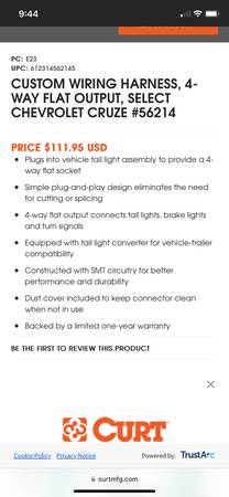 Installed so plug-in had to be flipped out of trunk, then never used, and subsequently removed when car was traded. Curt 56214 for GM Cruze and Verano without splicing wires. Other small cars if...