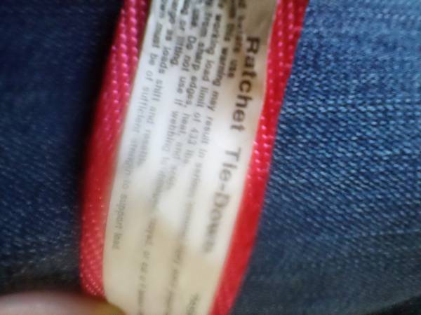 About 8ft. ratchet tie downs with 433pounds working load limit. Have 3 of them. $2 each Also have 1 8ft. With working load of 700 lbs. . Breaking point weight 2100. $2 All in Excellent condition. Or...